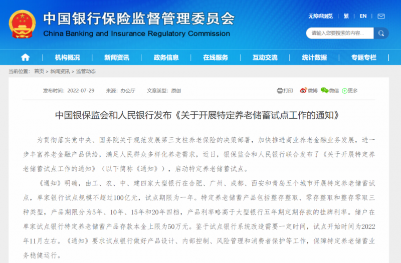 7月29日,据银保监会官网消息,近日,银保监会和人民银行联合发布了《关于开展特定养老储蓄试点工作的通知》(以下简称《通知》),启动特定养老储蓄试点。
